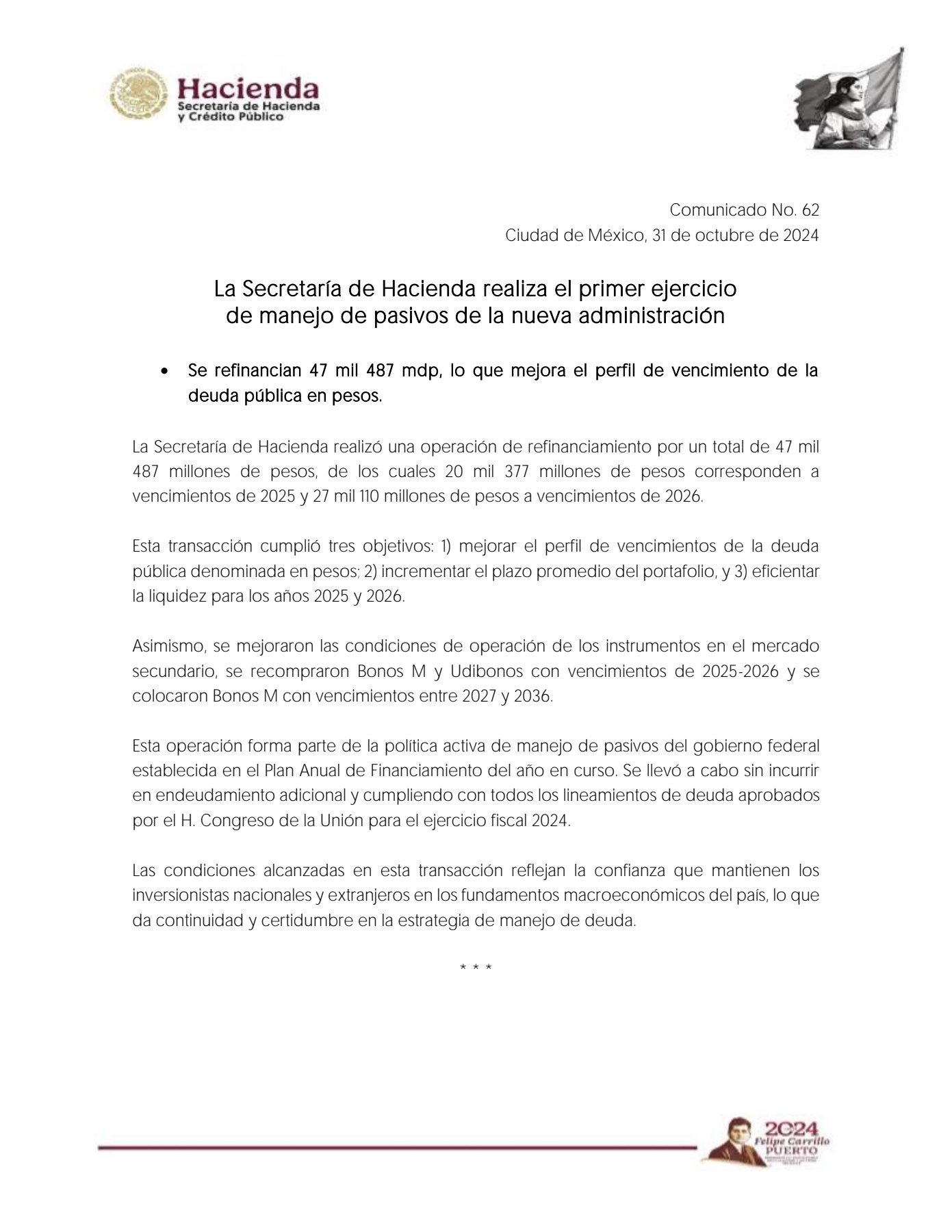 La Secretaría de Hacienda y Crédito Público (SHCP) de México informó este jueves que llevó a cabo una operación de refinanciamiento por un total de 47 mil 487 millones de pesos en la primera operación de este tipo bajo la administración de la presidenta, Claudia Sheinbaum, que inició el pasado 1 de octubre.