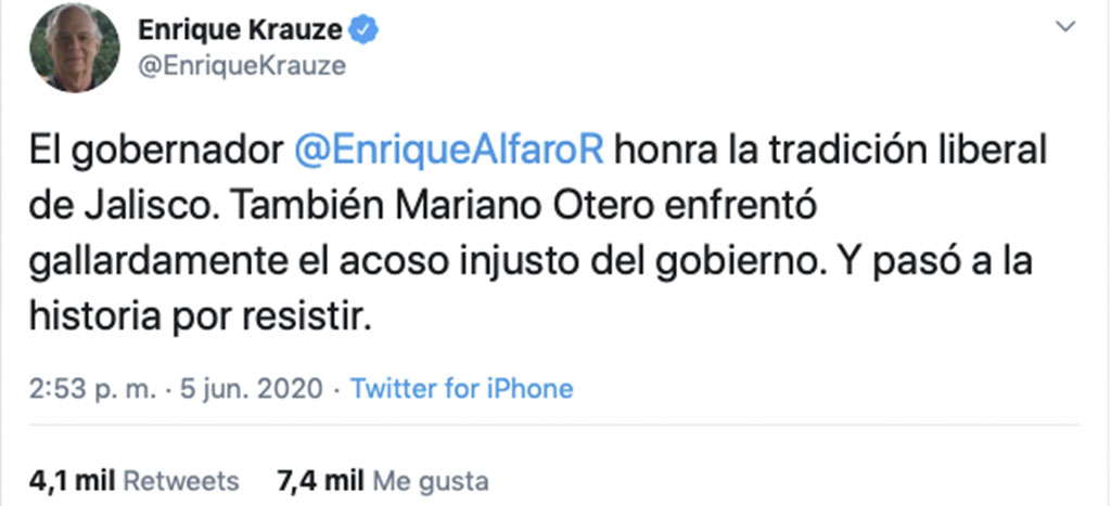 Enrique Alfaro “honra la tradición liberal de Jalisco”: Enrique Krauze | Tuit