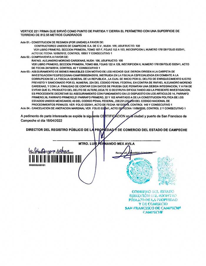 “Aseguramiento de bienes inmuebles con motivo de los hechos que dieron origen a la carpeta de investigación FED/FECC/UNAI-CAMP/00000294/2019, instruida en la Fiscalía Especializada en Combate a la Corrupción de la Fiscalía General de la República, previsto y sancionado por el numeral 224 del Código Penal Federal en contra de Rafael Alejandro Moreno Cárdenas, y con la finalidad de contar con datos de prueba que permitan una debida integración”, se expone en el documento.