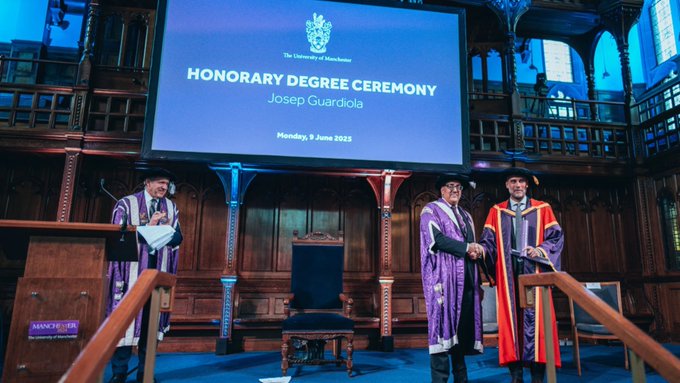 Pep Guardiola has been awarded an honorary degree by The University of Manchester, recognising his extraordinary contribution to our city over nine years on and off the pitch! 🩵 pic.twitter.com/2NQ9uiJ1f9