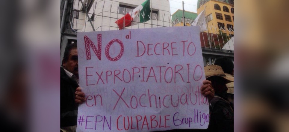 Pobladores de San Francisco Xochicuautla, Estado de México, se manifestaron este viernes 10 frente a la Comisión Nacional de Derechos Humanos (CNDH) contra el decreto publicado en el Diario Oficial de la Federación, el jueves 9, por el que se expropian 37 hectáreas de la comunidad, para la construcción de la autopista Toluca-Naucalpan a cargo de una filial de Grupo Higa.