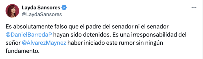 Tras las acusaciones, Sansores publicó en su cuenta oficial de X que “es absolutamente falso” que el padre del senador, ni el senador hayan sido detenidos.