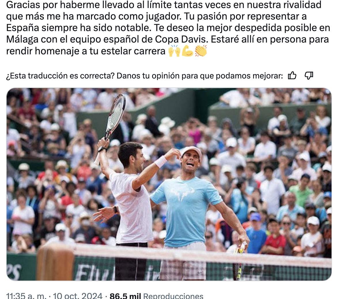 “Rafa, una publicación no es suficiente para expresar todo el respeto que te tengo y por lo que has hecho en nuestro deporte. Has inspirado a millones de niños a empezar a jugar al tenis y creo que probablemente es sea el mayor logro que cualquiera pueda desear”, dijo el de Belgrado.