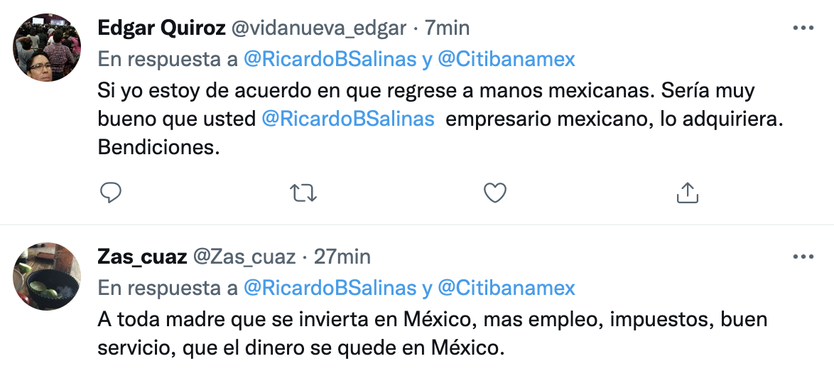 “Yo siempre he creído e invertido en México y los Mexicanos. Por eso le he pedido a mi equipo analizar la conveniencia de adquirir Citibanamex y redoblar mi apuesta en México, los Mexicanos y su futuro”.