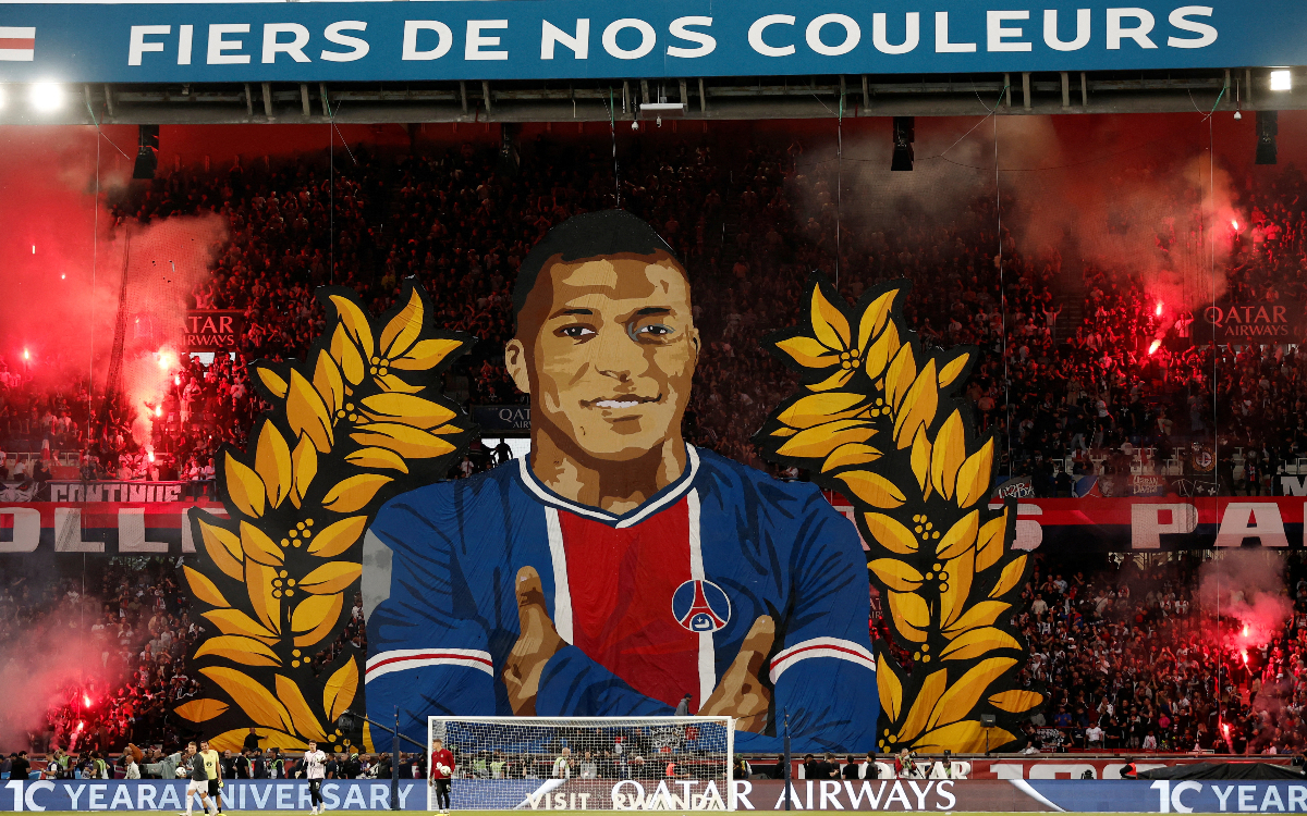 Antes de comenzar el partido, los ruidosos aficionados radicales del fondo Auteuil desplegaron un enorme tifo con Mbappé de medio cuerpo rodeado de unos laureles y encendieron bengalas rojas, y el jugador fue a saludarles y agradecerles el gesto.