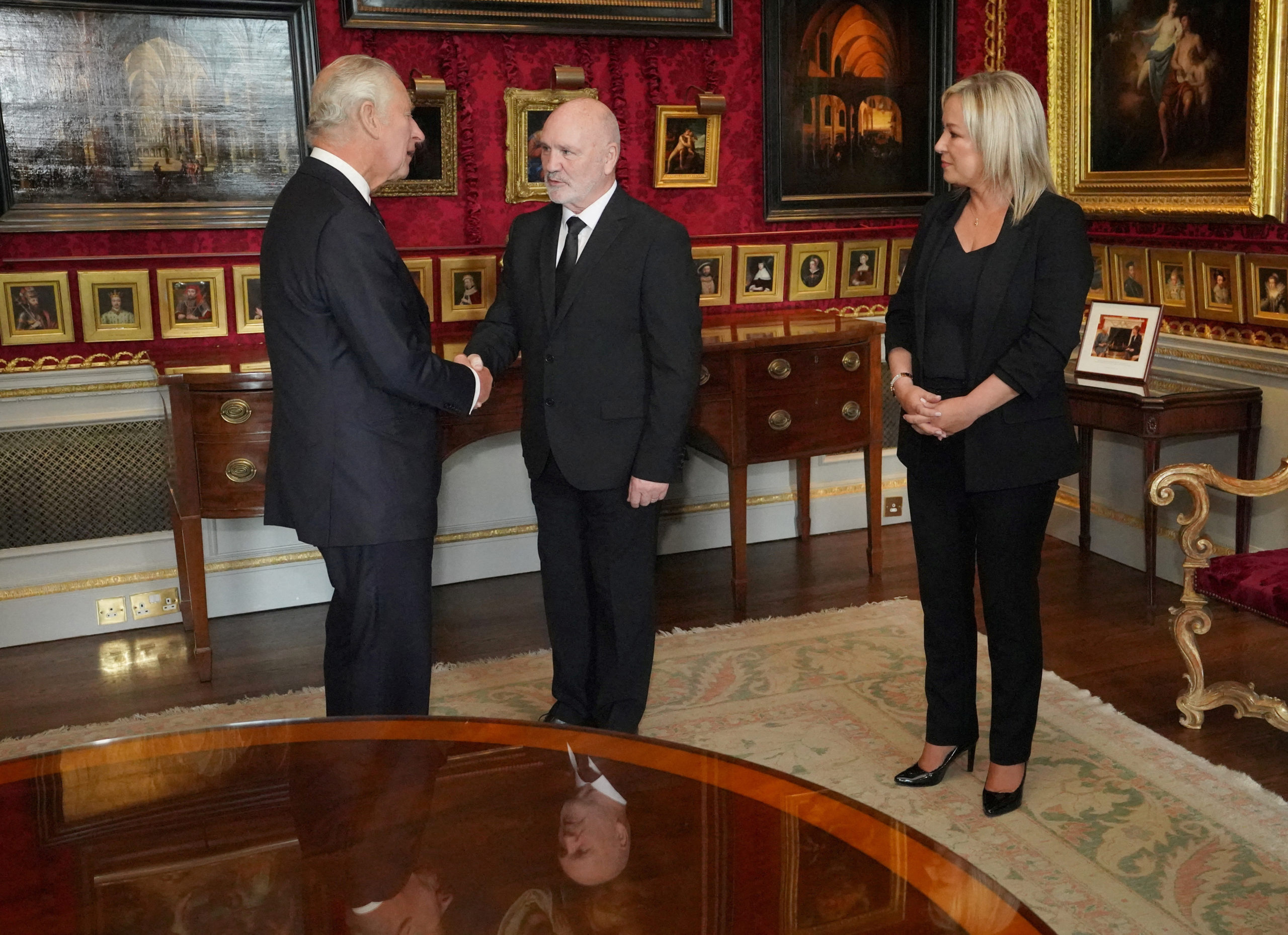 Carlos III también estrechó de manera calurosa la mano de la vicepresidenta del Sinn Fein, Michelle O’Neill, líder del partido en Irlanda del Norte.