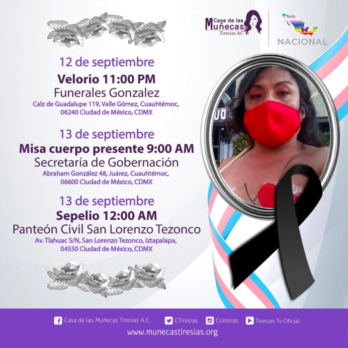 Para honrar su memoria, activistas y organizaciones LGBTIQ+ llevaron a cabo, el pasado miércoles, una misa de cuerpo presente afuera de la Secretaría de Gobernación (Segob); el mismo lugar donde ella mantuvo un plantón durante meses.