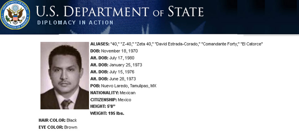 Para la DEA, es conocido también con los alias de ‘El 40’, ‘El Z-40’, ‘Zeta 40’, ‘David Estrada’, ‘Comandante Forty’, ‘El catorce’.
