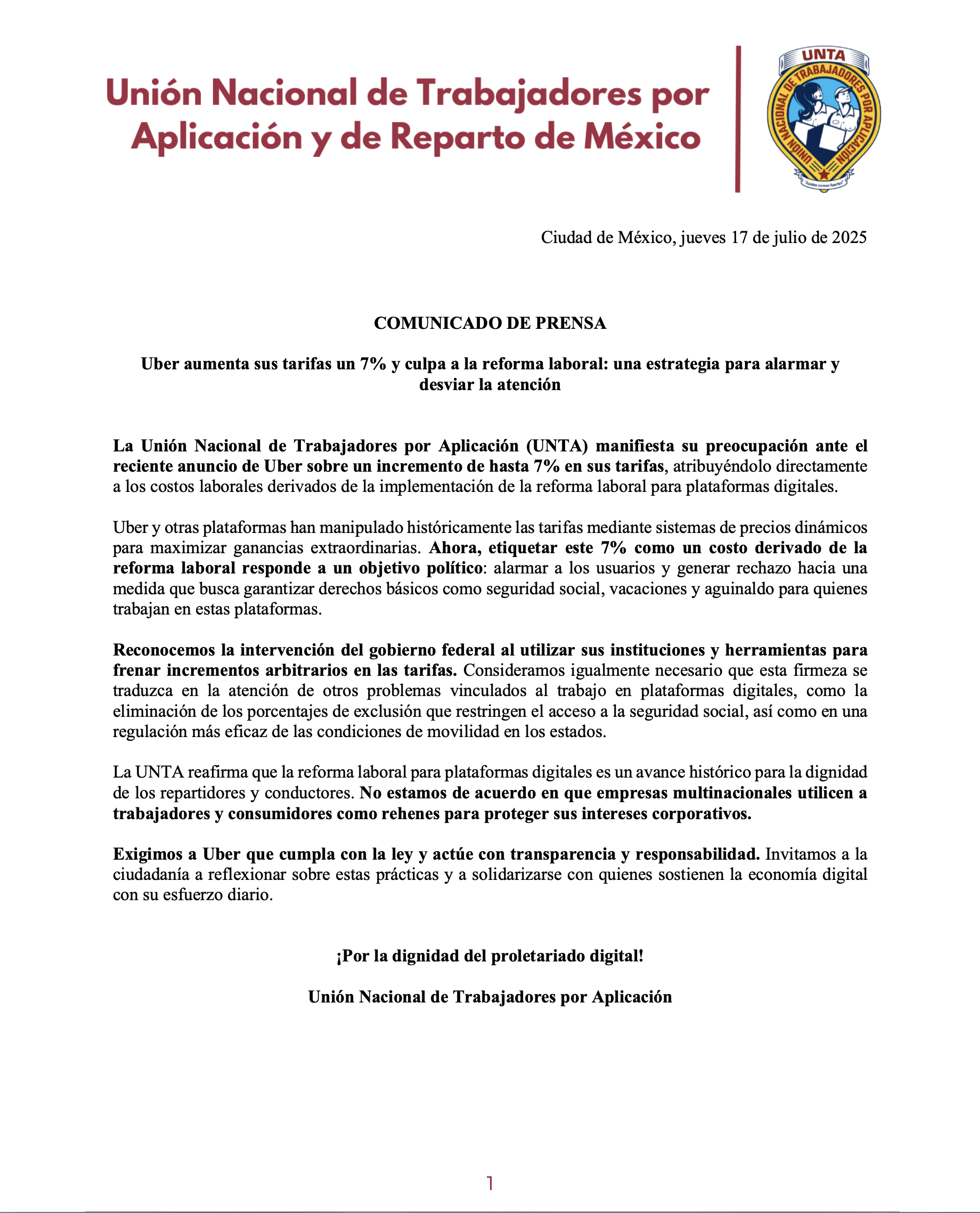 La Unión Nacional de Trabajadores por Aplicación (UNTA) expresó este jueves su rechazo ante la decisión de la plataforma Uber, señalando que el aumento es parte de una estrategia para generar alarma entre los usuarios y desviar la atención de los beneficios laborales que la reforma busca garantizar.