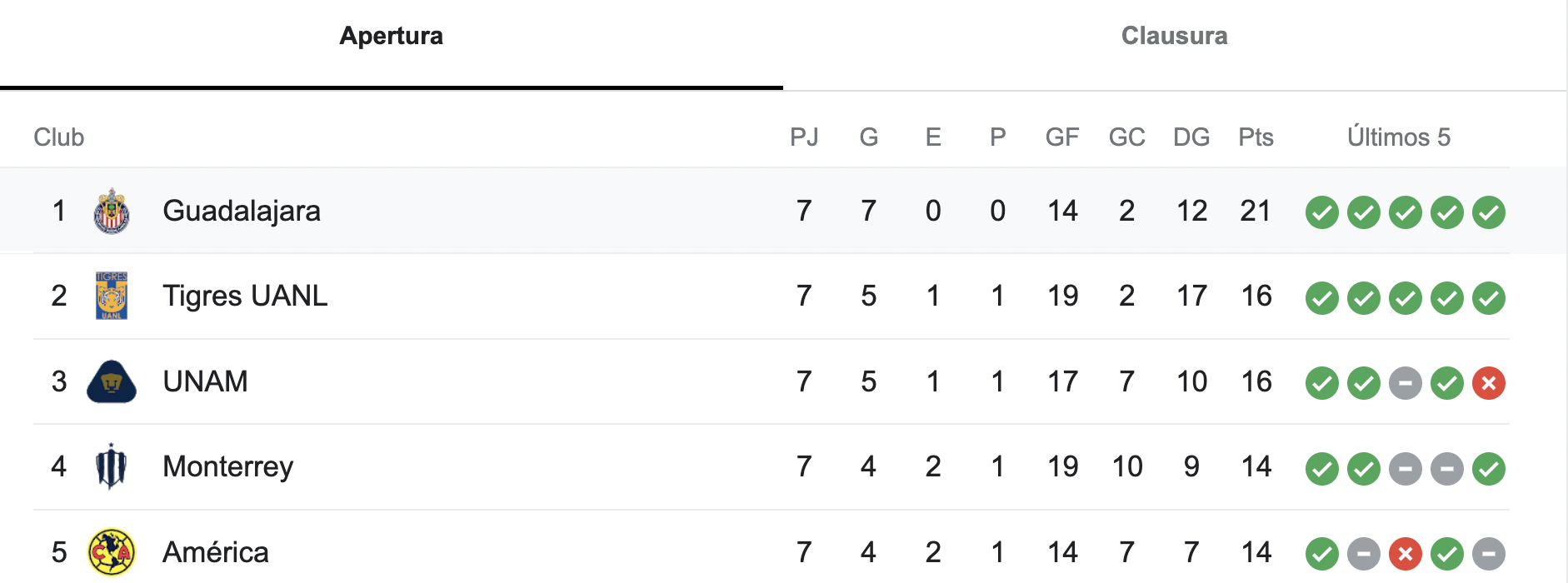 América Femenil, bajo el mando del estratega español Ángel Villacampa, se ubica en el quinto lugar general, luego de 7 jornadas, tras sumar 14 puntos, producto de cuatro victorias, dos empates y una derrota; Guadalajara encabeza la clasificación con 21 unidades.