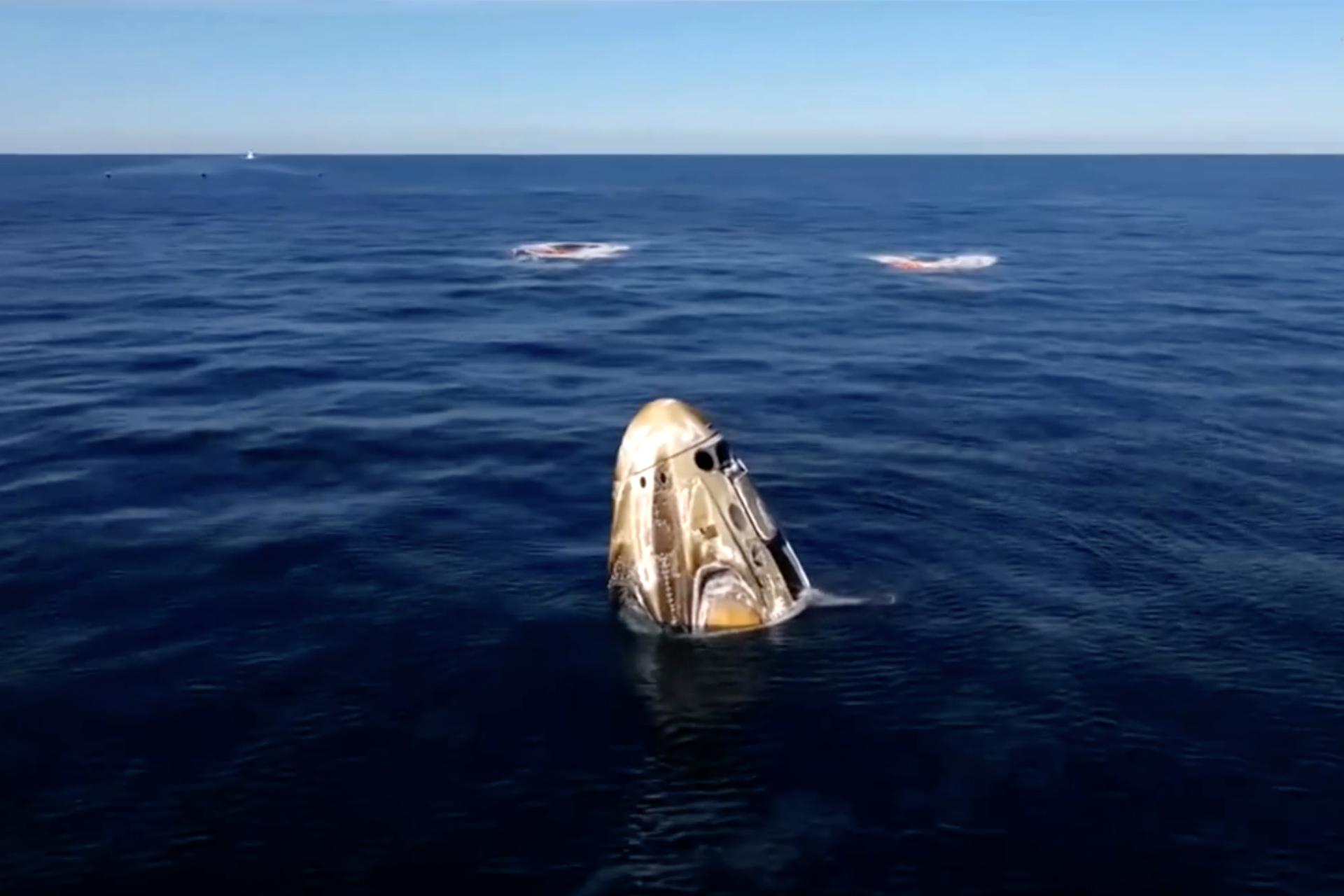 La cápsula desplegó sus paracaídas sin inconvenientes y tocó el agua con precisión en la zona designada, donde un equipo de recuperación de SpaceX y la NASA aguardaba para asistir a los tripulantes, a los que además se sumaron delfines.