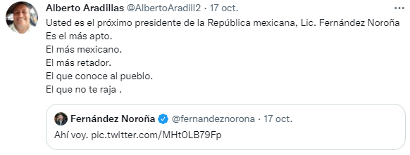 Según la encuesta realizada durante octubre, Fernández Noroña solo es superado por la jefa de Gobierno de la Ciudad de Mexico, Claudia Sheinbaum, con un 21.3% de preferencia; mientras que en el primer lugar se ubica el canciller Marcelo Ebrard con un 34%.