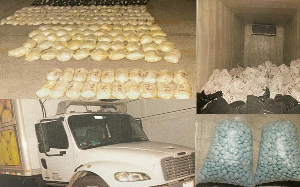 La FGR detalló que elementos de la Secretaría de la Defensa Nacional (Sedena), solicitaron revisar el tráiler donde hallaron 539 paquetes con clorhidrato de metanfetamina con un peso de más de 530 kilos, un paquete con 993.8 gramos de heroína y 42 bolsas con 725 mil 740 comprimidos de fentanilo; también le fue asegurado un teléfono celular, 60 tickets de compra y una tarjeta de circulación.