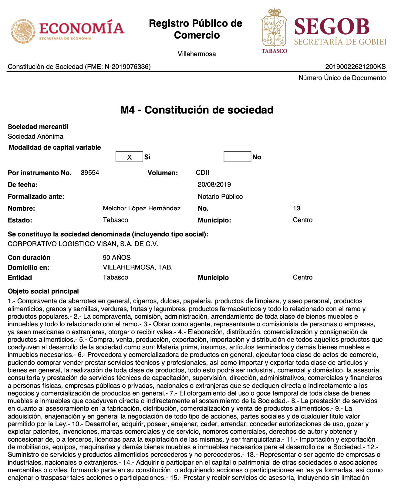 La empresa Corporativo Logístico Visan fue creada en agosto de 2019, a los siete meses de que Adán Augusto López asumió la gubernatura morenista en Tabasco, y para marzo de 2020 ya había sido incluido en el listado oficial de proveedores. En el acta constitutiva consta que su principal objeto social es la compraventa de abarrotes en general, así como cigarros, dulces, granos, semillas y otros productos alimenticios.