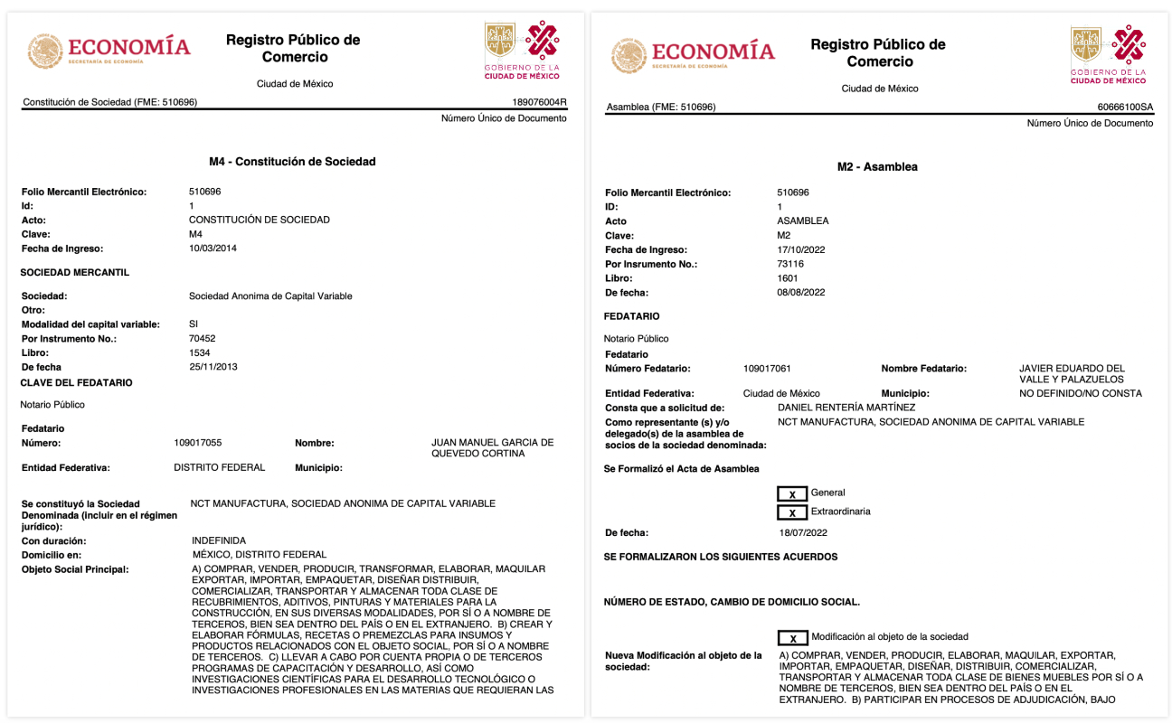 NCT Manufactura fue constituida en 2014 para comercializar recubrimientos, aditivos, pinturas y materiales para la construcción (documento de la izquierda); fue hasta julio de 2022 que amplió su objeto social a la compraventa de todo tipo de bienes muebles (derecha).
