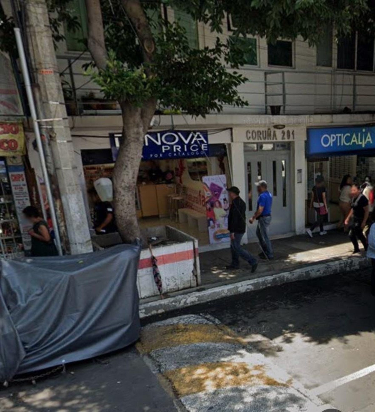 El departamento en el que se ubica la empresa Adiam está en un edificio sobre la calle Coruña de la colonia Viaducto, frente a un paradero de combis.