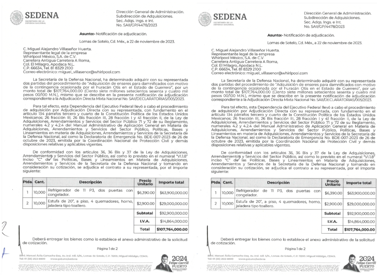 Pese a las diferencias de precio, la Sedena le compró para la emergencia por OTIS 22 mil refrigeradores a Digital Signage Solutions (que es una empresa intermediaria), mientras que a Whirlpool (que es fabricante) le compró sólo 10 mil.