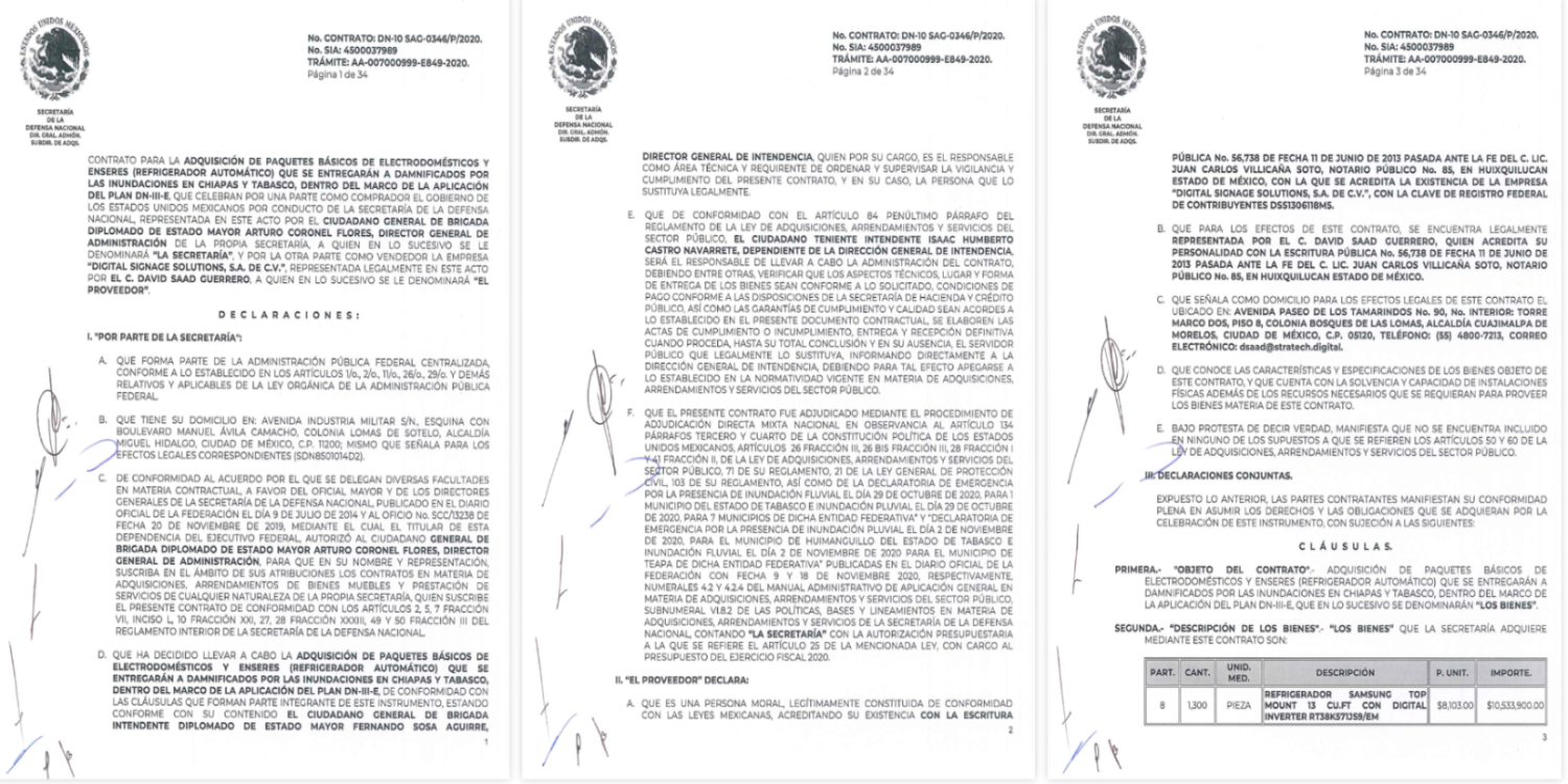 Tres años antes, en diciembre de 2020, la misma empresa especializada en tecnología le había vendido a la Sedena 7 mil 500 refrigeradores con valor de 72 millones 622 mil pesos, para repartirse entre los damnificados por las inundaciones en Chiapas y Tabasco, según consta en un contrato obtenido por MCCI.