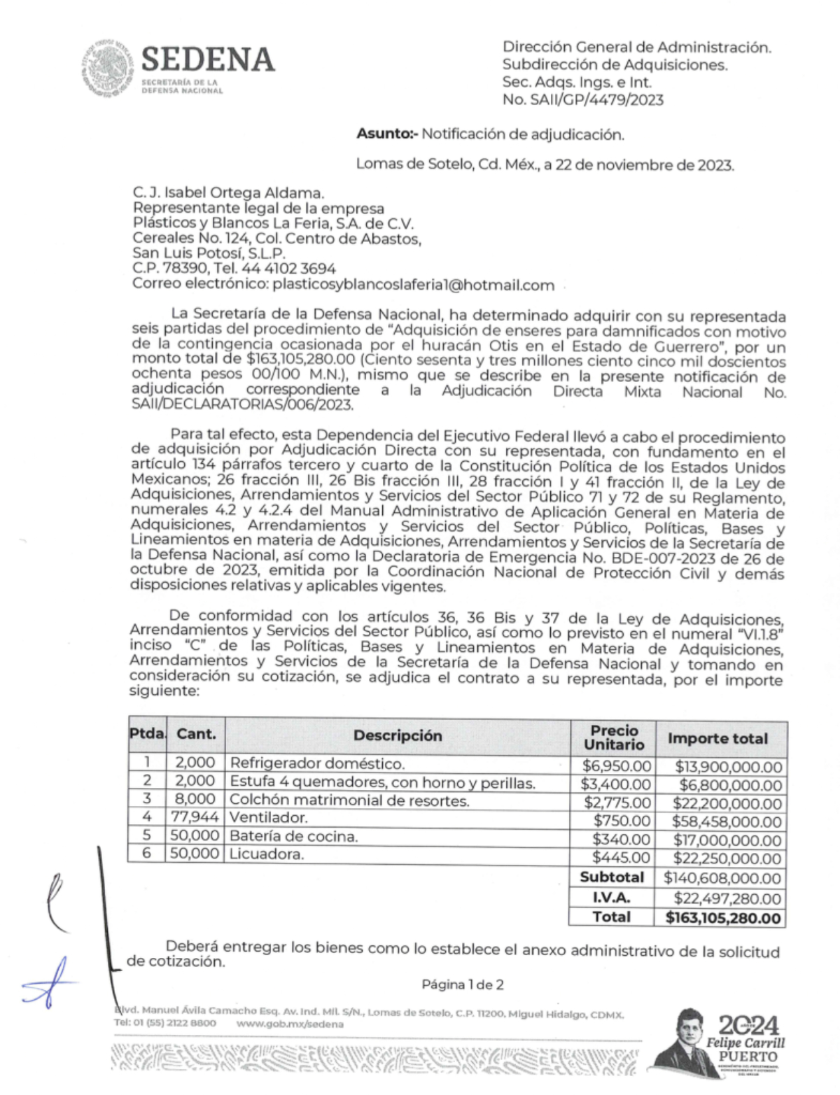 Al departamento que la empresa tiene como su domicilio en la capital del país, la Sedena le envió el 26 de noviembre de 2023 la notificación de que había sido beneficiada con una asignación directa por 37 millones 642 mil pesos para abastecer 11 mil colchones matrimoniales a los damnificados por el huracán Otis. Después de ese contrato, la Sedena le realizó más pedidos por una amplia variedad de productos.