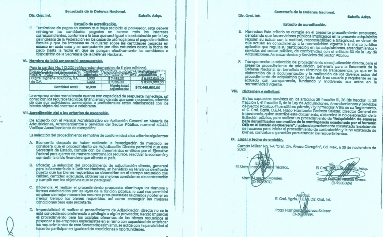 La Sedena le compró a la comercializadora Digital Signage Solutions 20 mil refrigeradores de 11 pies cúbicos a un precio unitario de 7 mil 690 pesos sin IVA.