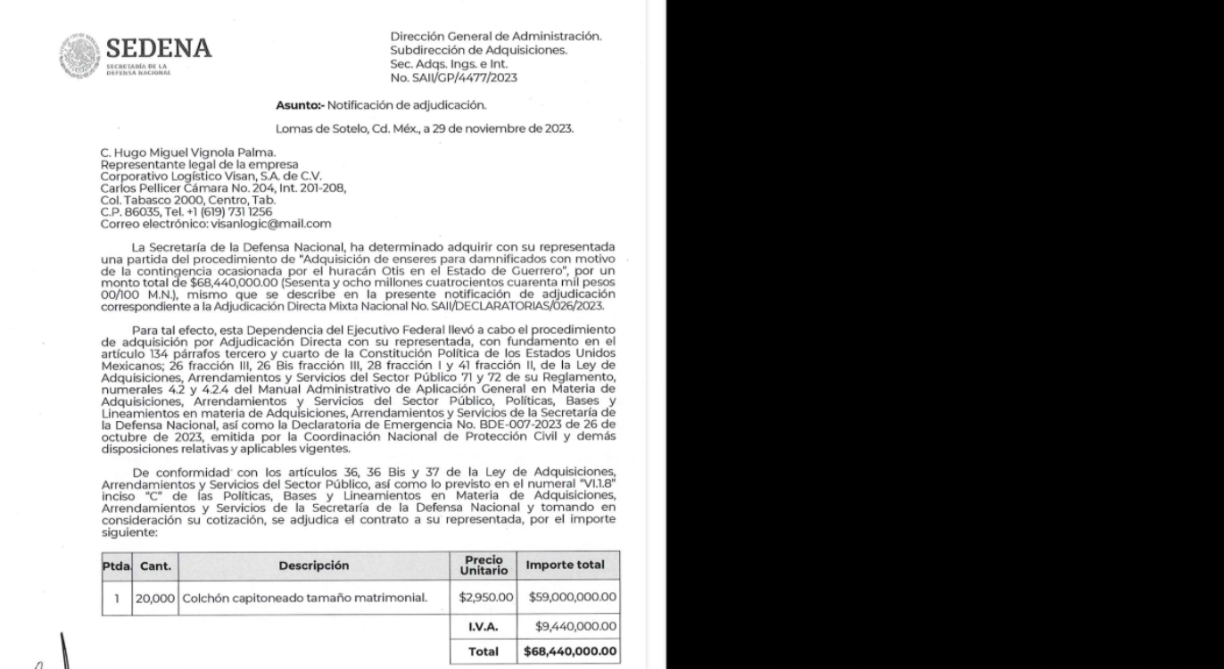 El 29 de noviembre de 2023 la Sedena notificó al representante legal de esa empresa que le había otorgado una adjudicación directa por 68.4 millones de pesos por concepto de compra de colchones matrimoniales. Para justificar la adjudicación directa, la Sedena informó en la plataforma de Compranet que había realizado previamente una investigación de mercado.