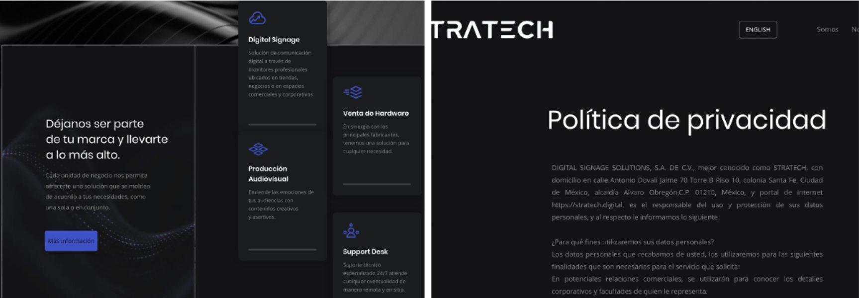El nombre comercial de Digital Signage Solutions es Stratech. En su sitio en internet se detalla que es una empresa enfocada en servicios de tecnología, no en la venta de electrodomésticos.