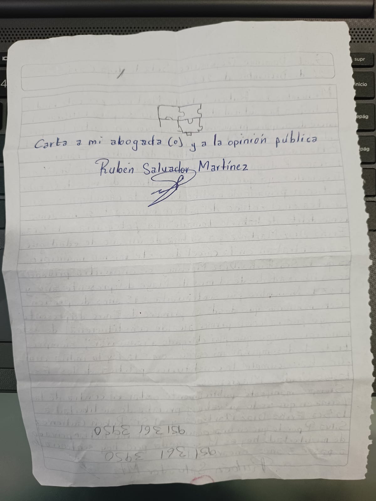 Con puño y letra y entintado de color azul, Rubén señala que ha promovido un juicio de amparo para obtener su libertad, pues le impusieron tres años de prisión por un delito que no existe, el de haberle tomado una fotografía a una mujer que vive también violencia dentro de una cárcel sin que exista justicia.