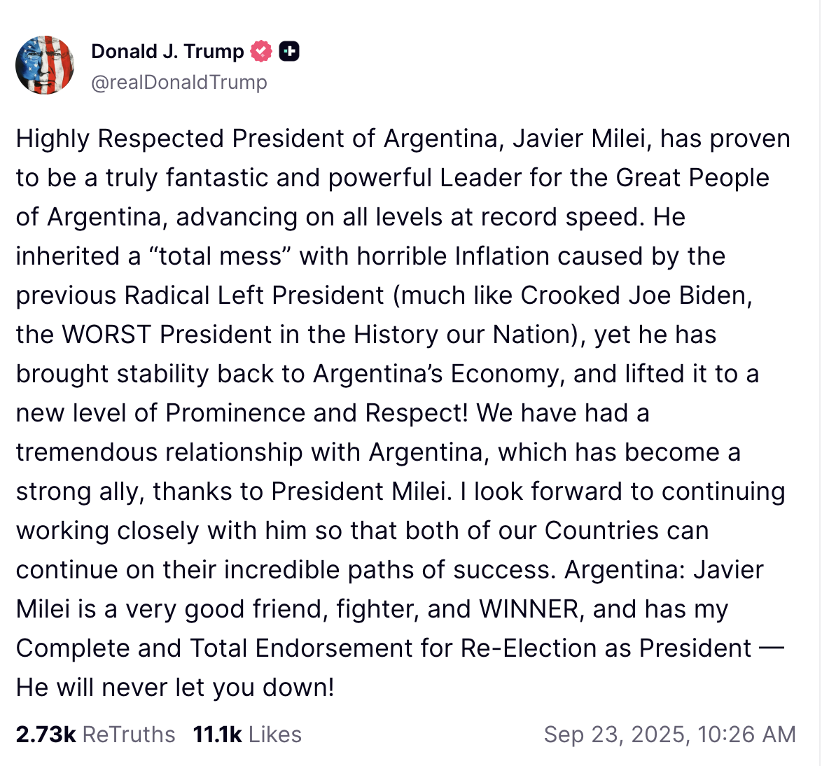 Por su parte, Milei ha agradecido en su perfil de X la “gran amistad” de Trump y el “gesto extraordinario” que supone su apoyo explícito.