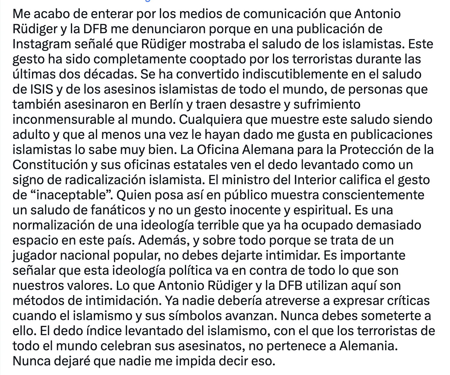 Soeben habe ich aus den Medien erfahren, dass Antonio Rüdiger und der DFB mich angezeigt haben, weil ich hier darauf aufmerksam gemacht habe, dass Rüdiger auf einem Instagram-Post den Gruß der Islamisten zeigt. Diese Geste ist in den letzten zwei Jahrzehnten von Terroristen… pic.twitter.com/6fX1GYN4VR