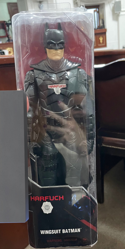Al finalizar la comparecencia en el Congreso local, una vecina de la alcaldía Benito Juárez le regaló a García Harfuch un muñeco de Batman, pero con la caja modificada para decir “Harfuch”.