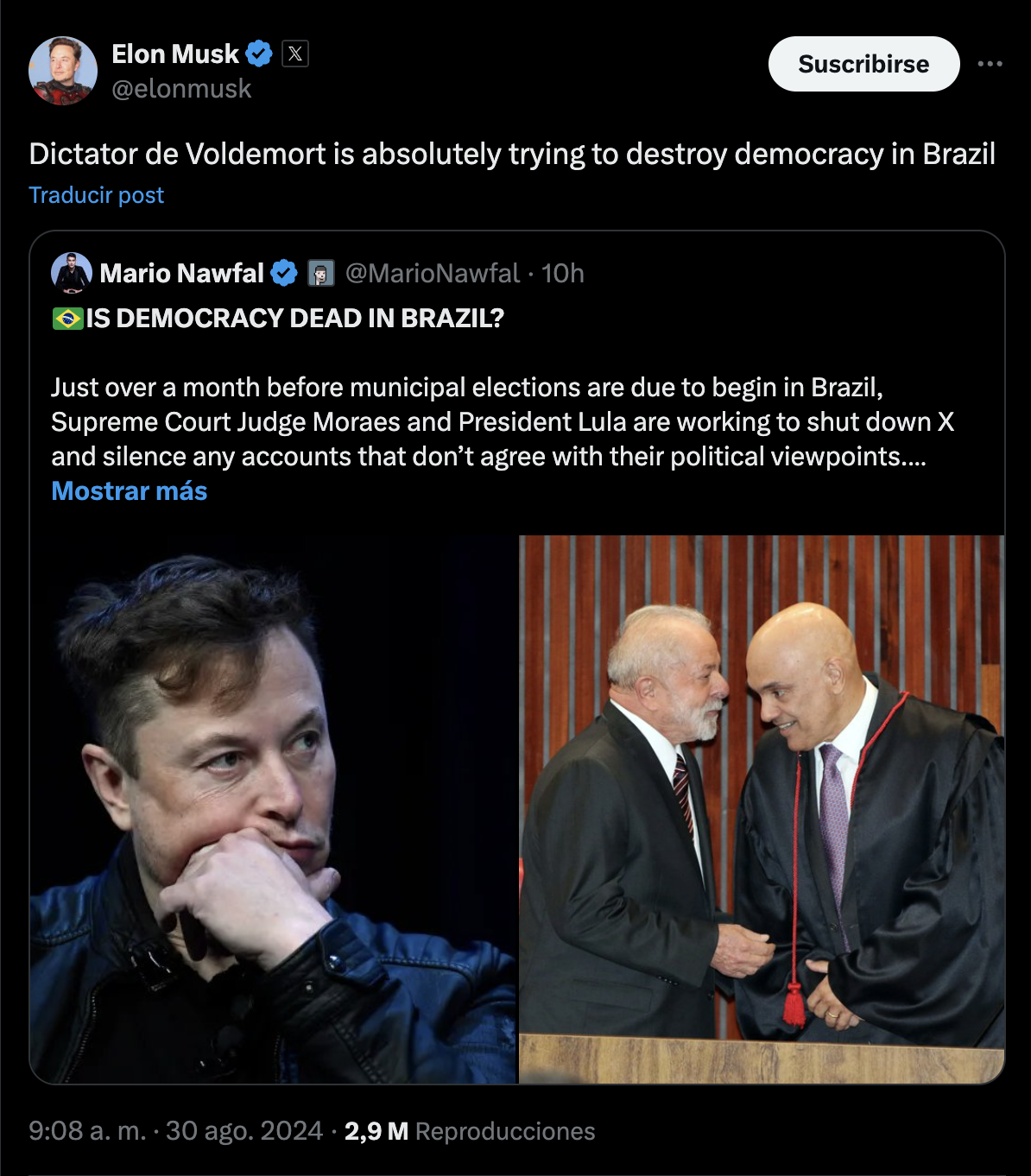 Musk continuó esta mañana publicando ataques en X contra el magistrado Alexandre de Moraes, a quien tachó de “desgracia para la toga de juez” y comparó con Lord Voldemort, el mago oscuro de los libros de ‘Harry Potter’.
