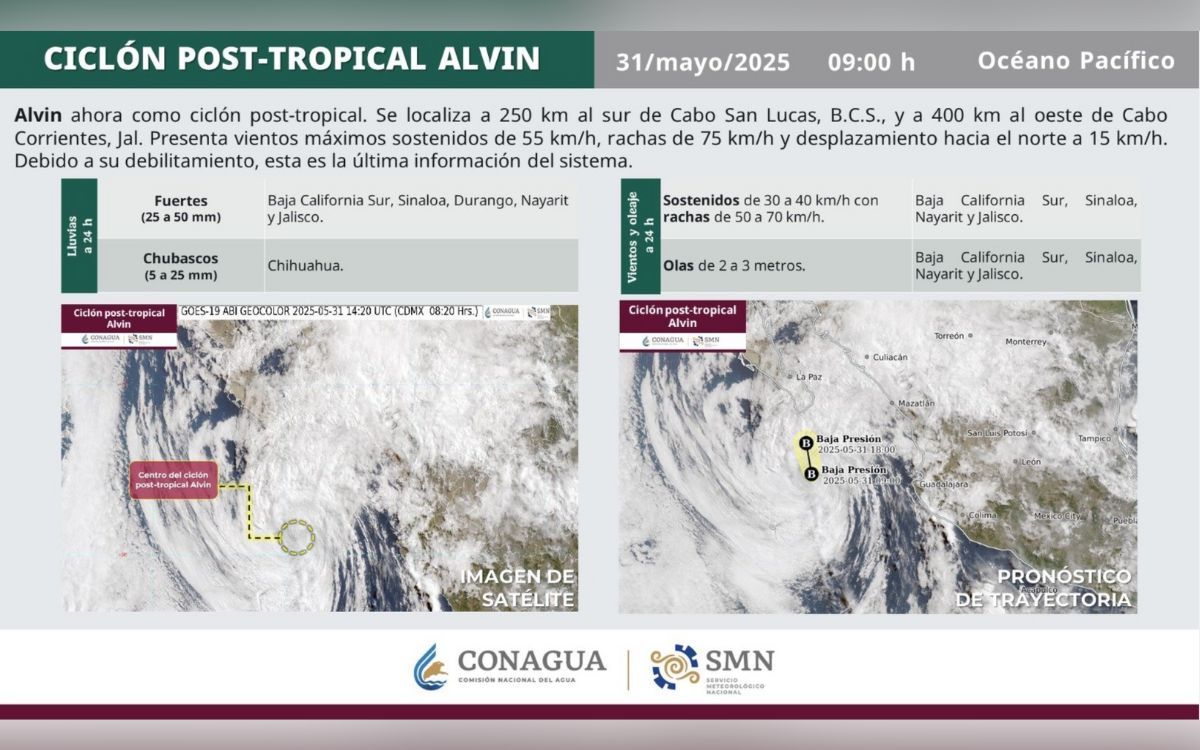 Pese a que en las próximas horas Alvin seguirá debilitándose hasta baja presión remanente, el meteoro ocasionará lluvias puntuales fuertes en Baja California Sur, Sinaloa, Nayarit y Jalisco; además de vientos con rachas de 50 a 70 kilómetros por hora y oleaje de 2 a 3 metros de altura en las costas de dichos estados.