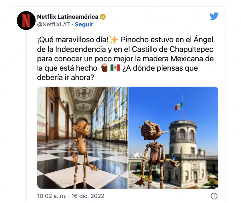 “Pinocho estuvo en el Ángel de la Independencia y en el Castillo de Chapultepec“, señaló Netflix en Twitter.