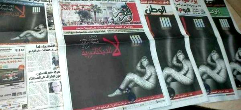 Periódicos de Egipto llevaron el lunes 3 en su portada el titular “No a la dictadura” con la imagen de un hombre envuelto en periódicos. Once diarios planean no aparecer el martes en protesta contra la decisión del presidente islamista Mohammed Morsi de convocar un referéndum constitucional. (Foto: @estermeerman)
