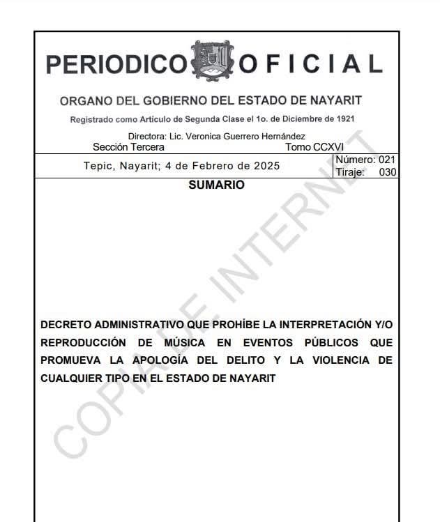 El decreto establece que “se prohíbe la interpretación y/o reproducción en eventos públicos de música comúnmente conocida como “corridos tumbados”, “narcocorridos” , “corridos”, “corridos progresivos”, “corridos bélicos“, “corridos alterados” y cualquier otro género de este tipo.