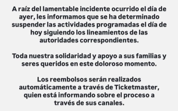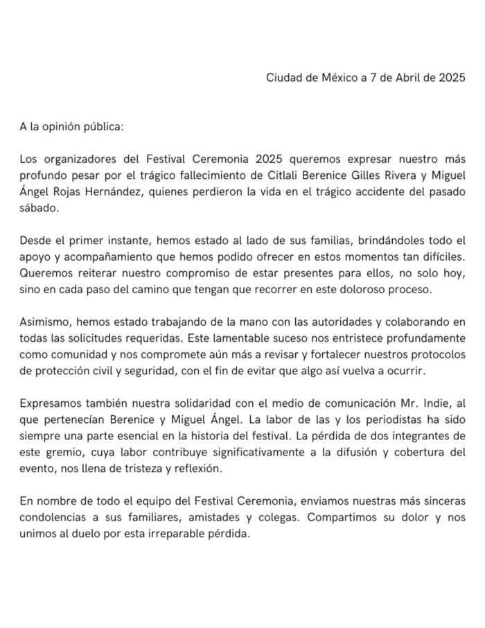 El festival sí se ha posicionado, primero a las 10 a.m. del 6 de abril y después a las 9 a.m. de este lunes. En su más reciente comunicado, Axe Ceremonia lamenta profundamente los fallecimientos y asegura que han estado del lado de sus familias. También asegura que colabora con las autoridades con todas las solicitudes requeridas.