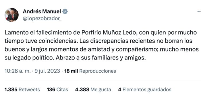 El presidente Andrés Manuel López Obrador lamentó la muerte del ex embajador de México ante Naciones Unidas y ex diputado federal, Porfirio Muñoz Ledo, reconociendo que en los últimos años había tenido un distanciamiento político con el fundador de la Corriente Democrática del PRI en 1987 y posterior artífice del Partido de la Revolución Democrática (PRD) en 1989, partido del que también se distanció en las elecciones presidenciales del 2000.