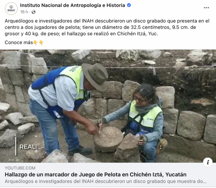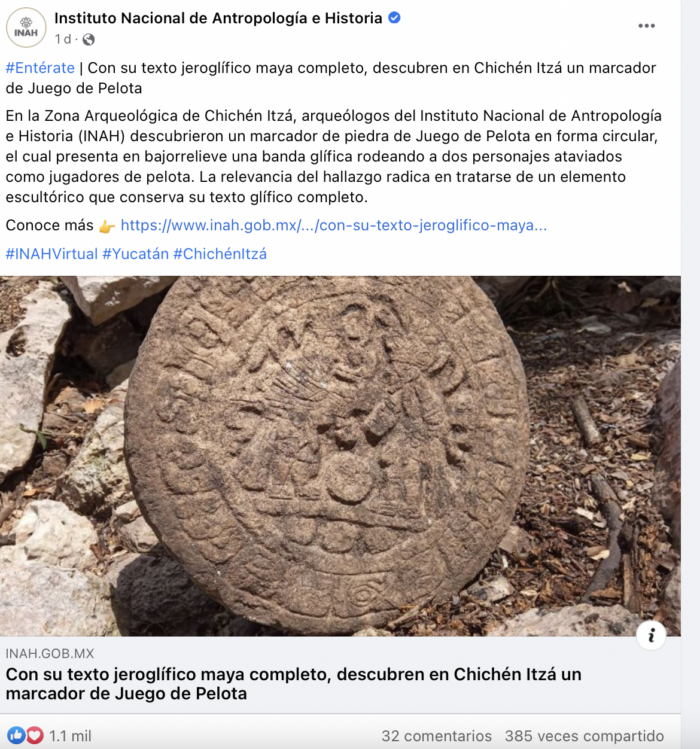 Un marcador de piedra de Juego de Pelota, el cual presenta en bajorrelieve una banda glífica rodeando a dos personajes ataviados como jugadores de pelota, fue descubierto en la Zona Arqueológica de Chichén Itzá, por arqueólogos del Instituto Nacional de Antropología e Historia (INAH).