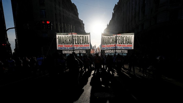 “Por trabajo y por salario contra el hambre y la pobreza”. El mensaje se ilumina a contraluz mientras el resto de la escena conserva su oscuridad. Ayer hubo una protesta en Buenos Aires contra la administración del presidente Alberto Fernández y las condiciones laborales en Argentina. De acuerdo con La Nación, manifestaciones y marchas a lo largo de todo el país habían comenzado desde hace dos días; en el contingente vemos a grupos con inclinación izquierdista que pertenecen a la Unidad Piquetera, nombre que se ha heredado del movimiento de trabajadores desocupados surgido a finales del siglo anterior en Argentina.