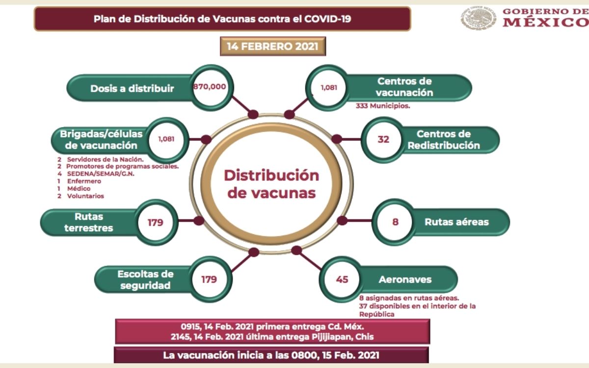 El secretario de la Defensa, Luis Cresencio Sandoval, detalló que las 870 mil dosis de la vacuna de AstraZeneca se distribuirán por tierra en 7 estados y por vía aérea en 25. Se abarcará en total 333 municipios.