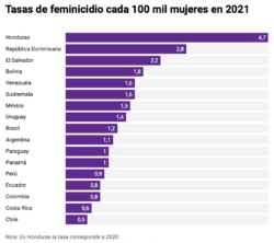 En Honduras también hay un programa llamado Ciudad Mujer, inspirado en el salvadoreño, que ha invertido 18,9 millones de dólares en cinco años. Cuando la iniciativa comenzó, en 2017, se reportaron oficialmente 235 feminicidios. En 2021 la cifra subió a 342, según la oenegé Centro de Derechos de Mujeres. Su directora, Tatiana Lara, explicó que la falta de coordinación entre instituciones gubernamentales impide mejores resultados. Por ejemplo, se construyeron tres habitaciones especiales (cámaras Gesell) para toma de declaración de víctimas, pero nunca han sido usadas por el Ministerio Público.