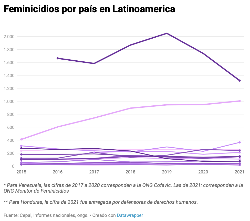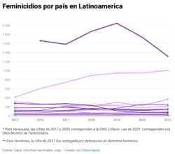 En 2016 según las cifras gubernamentales, hubo 122 feminicidios. Apenas un año después, el Comité de Familiares de Víctimas del Caracazo (Cofavic), una oenegé de derechos humanos venezolana, registró un alza del 74 por ciento: 213 feminicidios en 2017. La cifra continúa en ascenso. En 2021 el Monitor de Feminicidios contabiliza 239 y el Centro de Justicia y Paz 290. Karla Subero, miembro del equipo jurídico de Cofavic, sostiene que “la opacidad de la información oficial presentada es un elemento que, sin duda, contribuye al aumento de las cifras en materia de violencia de género, especialmente la relativa a los feminicidios”.