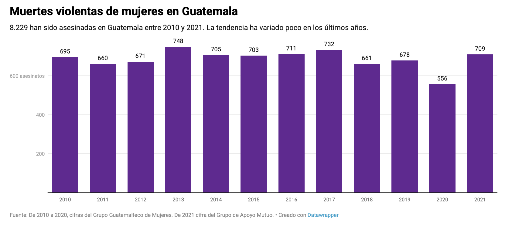 Según cifras del estatal Instituto Nacional de Ciencias Forenses de Guatemala, 652 mujeres fueron asesinadas de forma violenta en 2021, 145 víctimas más que en 2020. Esto contrasta con la cantidad de sentencias condenatorias y la lentitud de los procesos, los que pueden durar más de 5 años. Durante el primer semestre de 2022 solo hubo 48 sentencias condenatorias por casos de feminicidios.