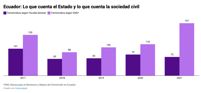 El subregistro es un problema transversal. En Ecuador las oenegés acusan que las cifras del Estado subestiman los datos reales. Por ejemplo, en 2021 la Fiscalía General contabilizó 70 feminicidios, pero según la Alianza para el Monitoreo y Mapeo de los Femicidios en Ecuador, hubo 197. Es decir, una mujer asesinada por razones de género cada 44 horas. Ese país se vio conmocionado por el feminicidio de la abogada María Belén Bernal durante septiembre de 2022. La última vez que se le vio con vida fue ingresando a la Escuela de Policía de Quito. Su esposo, Germán Cáceres, teniente e instructor en esa escuela, al momento de publicar este reportaje aún estaba prófugo. Hay una testigo que asegura que Cáceres golpeó a la víctima y que al menos 20 policías la habrían escuchado pedir ayuda, pero nadie la socorrió.