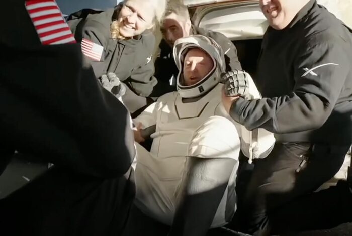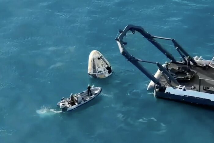 La cápsula desplegó sus paracaídas sin inconvenientes y tocó el agua con precisión en la zona designada, donde un equipo de recuperación de SpaceX y la NASA aguardaba para asistir a los tripulantes, a los que además se sumaron delfines.