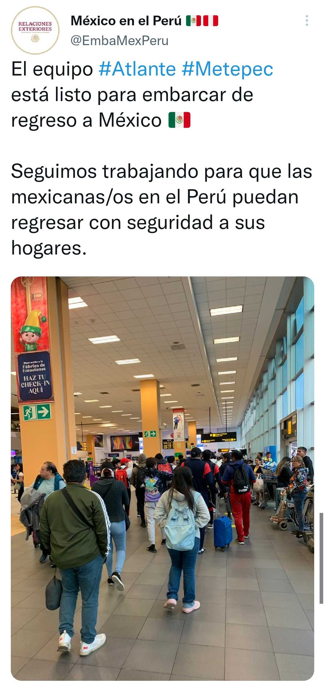 El equipo Atlante Metepec está listo para embarcar de regreso a México. Seguimos trabajando para que las mexicanas/os en el Perú puedan regresar con seguridad a sus hogares”.