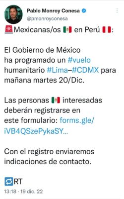 El embajador de México en Perú, Pablo Monroy Conesa, alertó a la comunidad mexicana para tomar el vuelo que habrá mañana martes 20 de diciembre, aunque continuará la salida programada de vuelos.