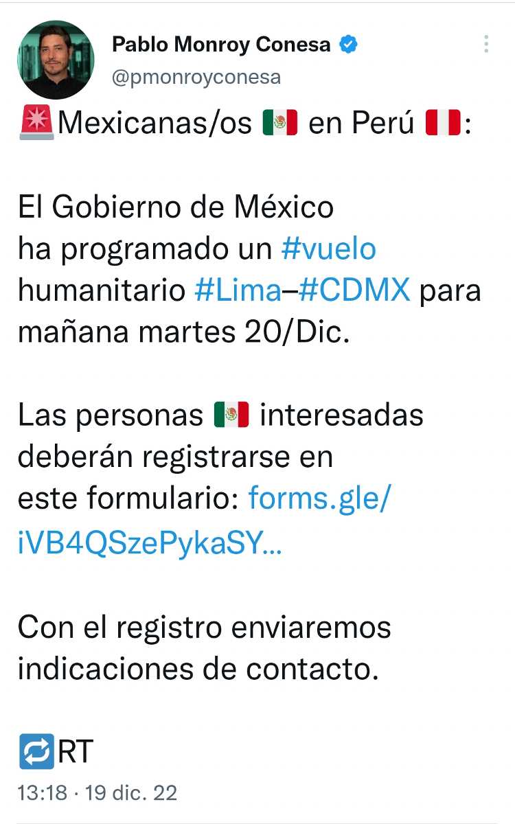 El Gobierno de México ha programado un #vuelo humanitario #Lima–#CDMX para mañana martes 20/Dic.Las personas interesadas deberán registrarse en este formulario: forms.gle/iVB4QSzePykaSY…Con el registro enviaremos indicaciones de contacto.