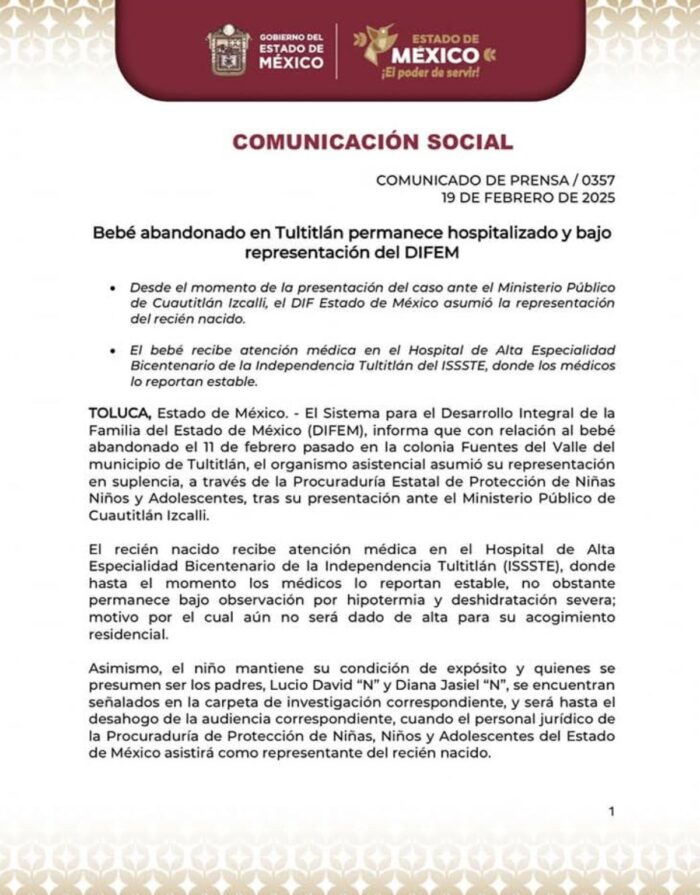 El bebé abandonado en Tultitlán sigue hospitalizado en el Hospital de Alta Especialidad Bicentenario de la Independencia del ISSSTE y permanece bajo la representación del Sistema para el Desarrollo Integral de la Familia del Estado de México (DIFEM), sin haber sido entregado a familiares.