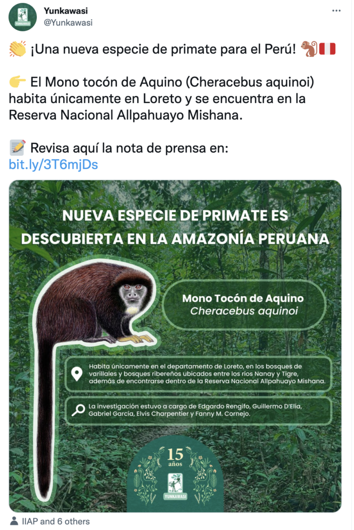 “Existe aún mucho por descubrir respecto a la diversidad de primates en el Perú. En esta publicación, hemos combinado la evidencia tanto morfológica como genética para describir a esta nueva especie para la ciencia”, menciona Fanny M. Cornejo, una de las autoras del estudio, directora ejecutiva de Yunkawasi y actual finalista al prestigioso premio Indianápolis por su trabajo en la conservación de especies de primates en Perú.